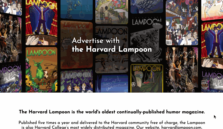 - Custom-designed header scrolls through past Lampoon covers and follows mouse with animation.