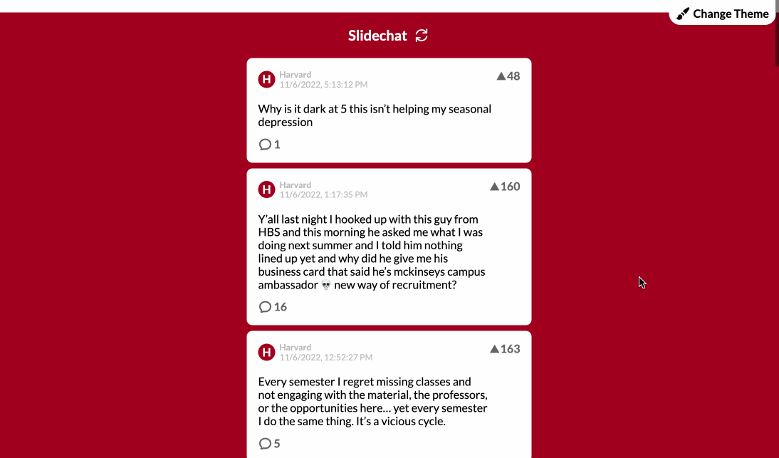 - Found a backdoor into the unpublished Sidechat API. Made a functioning “Sidechat for Web” called Slidechat where people can read top posts and comments on their computer.